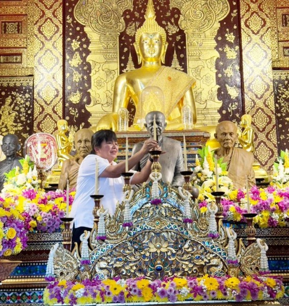 ศิริพร จงศิริ ผู้อำนวยการใหญ่ผลิตรายการคืนคุณให้แผ่นดิน ปวารณา พร้อมผู้ใหญ่ร่วมทำบุญและได้ให้ทีมงานร้านน้ำอ้อยดอกไม้สด ตลาดดอกไม้กาดหลวง เชียงใหม่ ช่างดอกไม้ฝีมือล้านนาได้จัดดอกไม้ถวายโทนดอกไม้สีฟ้า ,ดอกไม้สีเหลือง, และดอกไม้สีม่วง จัดดอกไม้ถวายงานในวันพฤหัสบดีที่ ๑๘ ธันวาคม ๒๕๖๘ งานสมโภชน์ ยกยอดฉัตร ๙ ชั้น เจดีย์ทั้ง ๓ ฉัตร เพื่อบูชาธรรมองค์สมเด็จพระสัมมาสัมพุทธเจ้าและเพื่ออุทิศถวายเป็นพระราชกุศลแด่ สมเด็จพระนางเจ้าสิริกิติ์ พระบรมราชินีนาถ พระบรมราชชนนีพันปีหลวง ณ วัดป่าศาลาปางสัก ( หลวงตามหาบัว ญาณสัมปันโน ) อำเภอดอยสะเก็ด จังหวัดเชียงใหม่