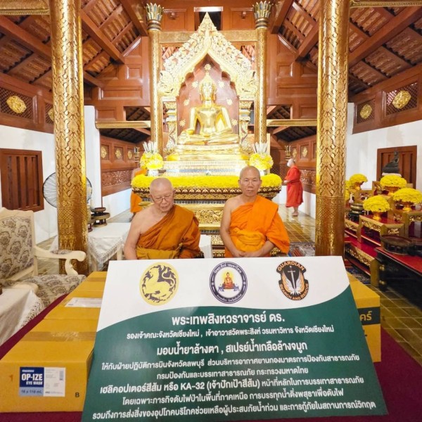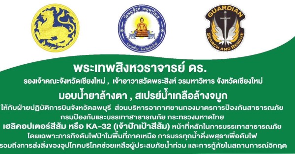 ” พระเทพปริยัติ (สอาด ขนฺติโก ป.ธ.๗) ที่ปรึกษาเจ้าคณะภาค ๗ เจ้าอาวาสวัดเจ็ดยอด (พระอารามหลวง ) , พระเทพสิงหวราจารย์ ดร รองเจ้าคณะจังหวัดเชียงใหม่ , เจ้าอาวาสวัดพระสิงห์วรมหาวิหาร จังหวัดเชียงใหม่..ห่วงใยสุขภาพร่างกายเจ้าหน้าที่การบรรเทาสาธารณภัย ภารกิจดับไฟป่าในพิ้นที่ภาคเหนือของนักบินเฮลิคอปเตอร์สีส้มหรือ KA-32 (เจ้าปักเป้าสีส้ม) ”