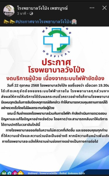 เพชรบูรณ์ – เมื่อเวลา 19.45 น. วันที่ 22 ตุลาคม 2568 ได้เกิดเหตุไฟฟ้าขัดข้องครั้งใหญ่ภายใน โรงพยาบาลวังโป่ง จังหวัดเพชรบูรณ์ ทำให้หลอดไฟในตึกอำนวยการและตึกผู้ป่วยระเบิดเกือบทั้งหมด พร้อมกลิ่นไหม้ลอยคลุ้งทั่วอาคาร ส่งผลให้ผู้ป่วยและญาติผู้ป่วยเกิดความตื่นตกใจอย่างมาก จนโรงพยาบาลต้องประกาศสถานการณ์ฉุกเฉินและดำเนินการอพยพผู้ป่วยออกจากพื้นที่อย่างเร่งด่วน