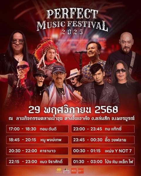 คอนเสิร์ต “Perfect Music Festival 2025” มีกำหนดจัดขึ้นในวันที่ 29 พฤศจิกายน 2568 ณ ตลาดน้ำชุน ทางขึ้นเขาค้อ อำเภอหล่มสัก จังหวัดเพชรบูรณ์ นับเป็นเทศกาลดนตรีที่คนเพชรบูรณ์รอคอย โดยรวบรวมศิลปินชื่อดังระดับตำนานยุค 90 อาทิ คาราบาว, หมู พงษ์เทพ กระโดนชำนาญ, แมว จิระศักดิ์ ปานพุ่ม, ทอม ดันดี และวง Why Not 7 มาร่วมสร้างความสุข สนุก และความทรงจำสุดพิเศษให้กับแฟนเพลงทุกวัย