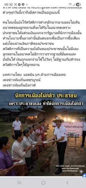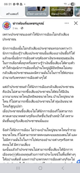 วันที่ 20 พฤศจิกายน 2568 — ผู้สื่อข่าวรายงานว่า เพจ ข่าวท้องถิ่นเพชรบูรณ์ ได้เผยแพร่บทความเชิงวิเคราะห์การเมืองโดยแอดมิน บก.ฝ่ายการเมือง ซึ่งกำลังถูกส่งต่ออย่างกว้างขวางในโลกออนไลน์ โดยเฉพาะในเครือข่ายสื่อท้องถิ่นจังหวัดภาคเหนือตอนล่างและภาคอีสาน บทความดังกล่าวสะท้อนข้อเท็จจริงอันน่ากังวลเกี่ยวกับ “ระบบซื้อเสียง” และปัญหาเชิงโครงสร้างที่ฝังรากลึกในสังคมการเมืองไทย