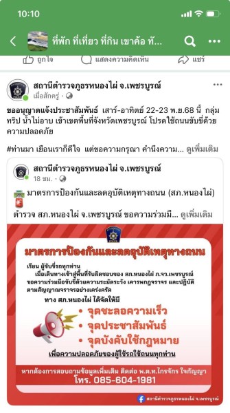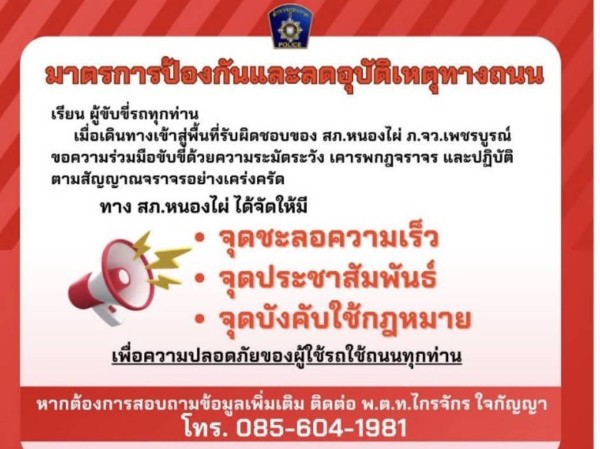 โดยการอำนวยการของ พ.ต.อ.ฐานุพงศ์ แสงซื่อ ผู้กำกับการ สภ.หนองไผ่ และคำสั่งกำชับของ พ.ต.ท.ไกรจักร ใจกัญญา สวป.สภ.หนองไผ่ ได้ให้เจ้าหน้าที่เร่งประชาสัมพันธ์ไปยังกลุ่มชุมชนในพื้นที่ เพื่อแจ้งเตือนการใช้เส้นทางและเน้นย้ำมาตรการป้องกัน–ลดอุบัติเหตุบนท้องถนนอย่างเคร่งครัด