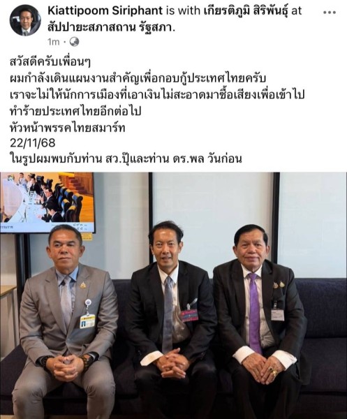 เมื่อวันที่ 22 พฤศจิกายน 2568 นายเกียรติภูมิ สิริพันธุ์ หัวหน้าพรรคไทยสมาร์ท ส่งข้อความผ่านไลน์กลุ่มภายในพรรค ระบุว่าขณะนี้กำลังเดินหน้า “แผนงานสำคัญเพื่อกอบกู้ประเทศไทย” พร้อมประกาศจุดยืนชัดเจนว่าจะไม่ยอมให้การเมืองไทยกลับไปอยู่ในวงจรเดิมที่ “เงินไม่สะอาด” ถูกใช้ซื้อเสียงเพื่อเปิดทางให้นักการเมืองเข้าสู่อำนาจแล้วกอบโกยผลประโยชน์ส่วนตน