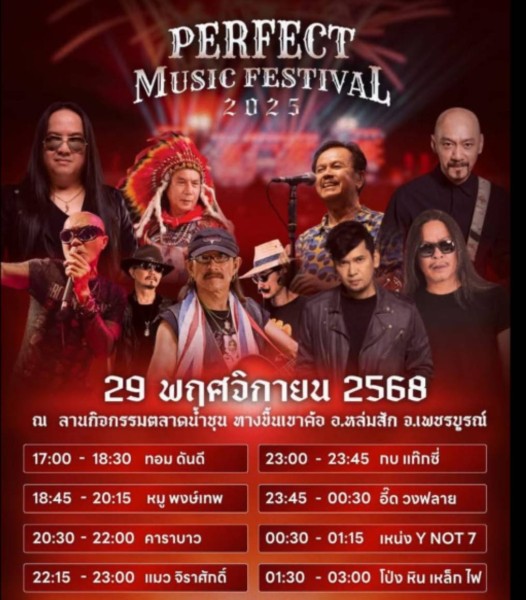 วันที่ 24 พฤศจิกายน 2568 จังหวัดเพชรบูรณ์เตรียมเปิดเวทีต้อนรับมหกรรมดนตรีปลายปี Perfect Music Festival 2025 ซึ่งกำหนดจัดขึ้นในวันที่ 29 พฤศจิกายน 2568 ณ ลานกิจกรรมตลาดน้ำชุน ทางขึ้นเขาค้อ อำเภอหล่มสัก โดยปีนี้ผู้จัดงานยกระดับการบริหารพื้นที่และระบบอำนวยความสะดวกแบบครบวงจร พร้อมชูแนวคิด “พื้นที่ใช้งานเป็นสัดส่วน” เพื่อให้ผู้เข้าร่วมงานได้รับความปลอดภัยและความสะดวกสูงสุด