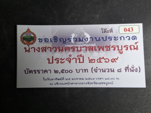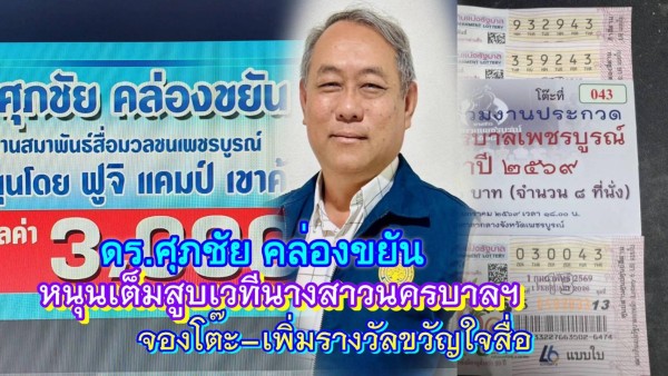 เพชรบูรณ์ – เมื่อวันที่ 20 มกราคม 2569 ดร.ศุภชัย คล่องขยัน ผู้บริหารฟูจิเคมป์ เขาค้อ ในฐานะประธานสมาพันธ์สื่อมวลชนเพชรบูรณ์ ได้ร่วมสนับสนุนกิจกรรมภายในงานมะขามหวานนครบาลเพชรบูรณ์ ประจำปี 2569 โดยการจองโต๊ะอาหารร่วมงานประกวดนางสาวนครบาลเพชรบูรณ์ ราคาบัตรโต๊ะละ 2,500 บาท (1 โต๊ะ 8 ที่นั่ง) ซึ่งมีกำหนดจัดขึ้นในวันอาทิตย์ที่ 25 มกราคม 2569 ณ บริเวณหน้าเวทีกลาง หน้าศาลากลางจังหวัดเพชรบูรณ์