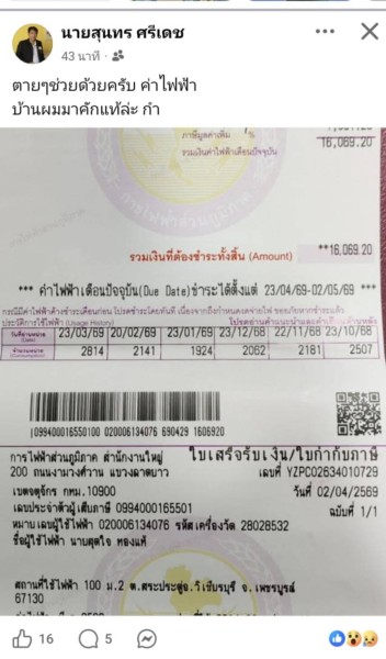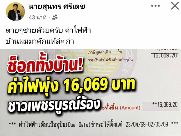 เมื่อวันที่ 22 เมษายน 2569 ผู้ใช้เฟซบุ๊กชื่อ “นายสุนทร ศรีเดช” ได้โพสต์ข้อความร้องทุกข์ผ่านสื่อสังคมออนไลน์ ระบุว่า “ตายๆช่วยด้วยครับ ค่าไฟฟ้าบ้านผมมาคักแท้ล่ะ กำ” ภายหลังได้รับใบแจ้งค่าไฟฟ้าประจำเดือน ซึ่งมียอดชำระสูงถึง 16,069.20 บาท สร้างความตกใจและตั้งข้อสงสัยถึงความผิดปกติของการใช้ไฟฟ้าในครัวเรือน