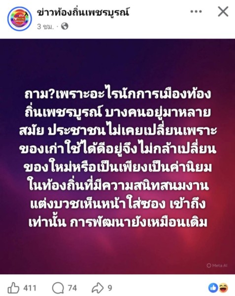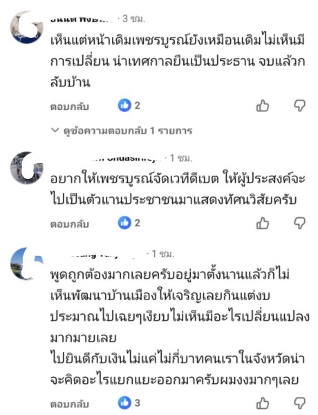 เพจดังกล่าวยังตั้งคำถามต่อไปว่า แม้นักการเมืองบางรายจะดำรงตำแหน่งมายาวนาน แต่ภาพรวมของการพัฒนาในหลายพื้นที่กลับยังคง “เหมือนเดิม” สะท้อนถึงความท้าทายของระบบการเมืองท้องถิ่น ที่อาจยังไม่เปิดพื้นที่ให้แนวคิดใหม่ คนรุ่นใหม่ หรือการแข่งขันเชิงนโยบายอย่างแท้จริง