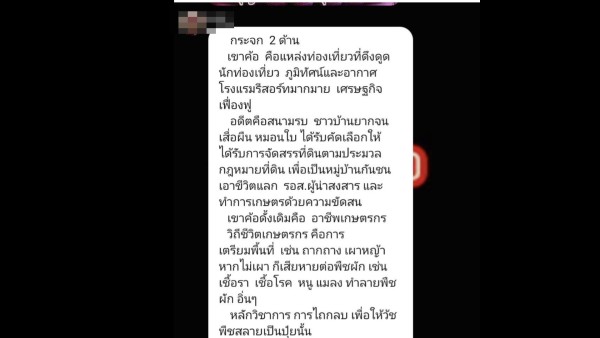 ข้อความระบุว่า เขาค้อในอดีตเป็นพื้นที่สนามรบ ชาวบ้านจำนวนมากยากจน เสื่อผืนหมอนใบ ได้รับการจัดสรรที่ดินตามประมวลกฎหมายที่ดินในฐานะหมู่บ้านกันชน และยังคงดำรงชีพด้วยอาชีพเกษตรกรรมมาจนถึงปัจจุบัน โดยการถากถางและเผาหญ้าเป็นส่วนหนึ่งของกระบวนการเตรียมแปลงเพาะปลูกที่ใช้กันมาอย่างยาวนาน