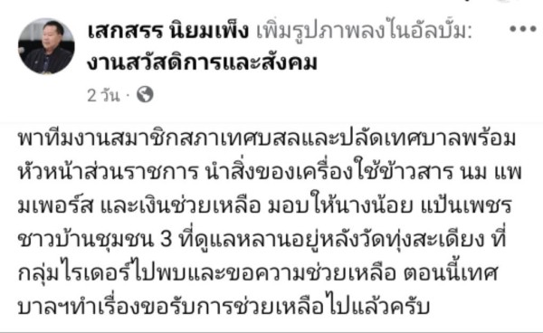 ล่าสุด ดร.เสกสรร นิยมเพ็ง นายกเทศมนตรีเทศบาลเมืองเพชรบูรณ์ ได้โพสต์ข้อความผ่านเฟซบุ๊กส่วนตัว “เสกสรร นิยมเพ็ง” ระบุว่า ได้นำทีมสมาชิกสภาเทศบาล ปลัดเทศบาล และหัวหน้าส่วนราชการ ลงพื้นที่นำข้าวสาร นม ผ้าอ้อมสำเร็จรูป เครื่องใช้จำเป็นสำหรับเด็ก รวมถึงเงินช่วยเหลือเบื้องต้น ไปมอบให้นางน้อย แป้นเพชร ชาวบ้านชุมชน 3 ซึ่งเป็นผู้ดูแลหลานทารกรายดังกล่าว พร้อมยืนยันว่า เทศบาลเมืองเพชรบูรณ์ได้ดำเนินการจัดทำเรื่องขอรับการช่วยเหลือจากหน่วยงานที่เกี่ยวข้องแล้ว