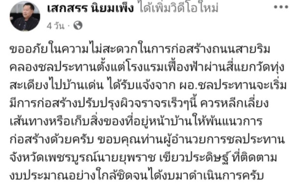 วันที่ 11 กุมภาพันธ์ 2569 ดร.เสกสรร นิยมเพ็ง นายกเทศมนตรีเมืองเพชรบูรณ์ ออกมาแสดงจุดยืนอย่างชัดเจนผ่านเฟซบุ๊กส่วนตัว “เสกสรร นิยมเพ็ง” กรณีกระแสวิพากษ์วิจารณ์เรื่องโครงการปรับปรุงถนนสายริมคลองชลประทาน โดยยืนยันหนักแน่นว่า งบประมาณดังกล่าวเป็นของกรมชลประทาน ไม่ใช่งบของเทศบาล พร้อมระบุข้อความตรงไปตรงมาว่า