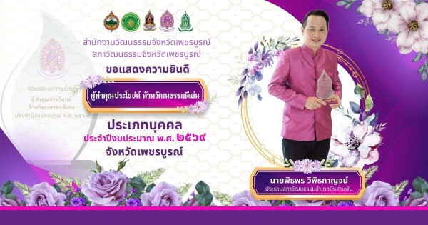 จังหวัดเพชรบูรณ์ โดยสภาวัฒนธรรมจังหวัดเพชรบูรณ์ ร่วมกับสำนักงานวัฒนธรรมจังหวัดเพชรบูรณ์ ประกาศผลการคัดเลือกผู้ทำคุณประโยชน์ด้านวัฒนธรรมดีเด่น ประจำปีงบประมาณ พ.ศ. 2569 เพื่อยกย่องเชิดชูบุคคลและองค์กรที่อุทิศตนขับเคลื่อนงานวัฒนธรรมอย่างเป็นรูปธรรม สร้างความเข้มแข็งให้สังคม และต่อยอดทุนทางวัฒนธรรมสู่การพัฒนาเศรษฐกิจวัฒนธรรมอย่างยั่งยืน