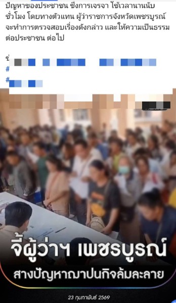 เมื่อวันที่ 23 กุมภาพันธ์ 2569 ภายหลังเกิดกระแสวิพากษ์วิจารณ์ในสื่อสังคมออนไลน์ กรณีมีภาพประชาชนจำนวนมากรวมตัวบริเวณศาลากลางจังหวัดเพชรบูรณ์ จนถูกเข้าใจว่าเป็นการ “บุกทวงถามปัญหาฌาปนกิจสงเคราะห์” ล่าสุด ธีระชัย มังกรทอง หัวหน้าประชาสัมพันธ์จังหวัดเพชรบูรณ์ ออกมาโพสต์ชี้แจงผ่านเฟซบุ๊กส่วนตัว “ธีระชัย มังกรทอง” ยืนยันข้อเท็จจริงอย่างชัดเจน