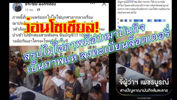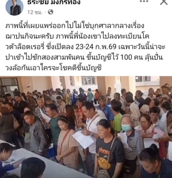 โดยระบุข้อความว่า ภาพดังกล่าวไม่ใช่การรวมตัวเรียกร้องกรณีฌาปนกิจ แต่เป็นภาพประชาชนที่เดินทางมาลงทะเบียนโควต้าลอตเตอรี่ ซึ่งเปิดรับลงทะเบียนระหว่างวันที่ 23–24 กุมภาพันธ์ 2569 เท่านั้น พร้อมคาดการณ์ว่าเฉพาะวันแรกมีผู้มาลงทะเบียน “สองถึงสามพันคน” ขณะที่จำนวนผู้ที่จะได้รับการขึ้นบัญชีมีเพียง 100 ราย และต้องใช้วิธีจับสลากหมุนวงล้อคัดเลือกผู้มีสิทธิ์