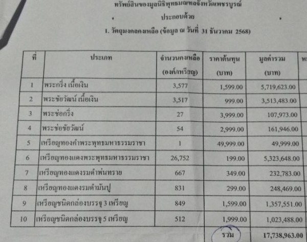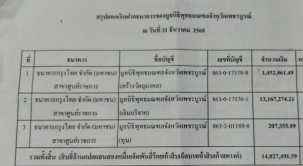 พระเทพพัชรบัณฑิต ได้กล่าวรายงานถึงการดำเนินงานและสถานะทางการเงินของมูลนิธิพุทธมณฑลจังหวัดเพชรบูรณ์ โดยแบ่งออกเป็น 4 ส่วน ได้แก่ ส่วนที่ 1 เงินบริจาคเริ่มต้นจากวัดสนธิกร จำนวน 207,355.89 บาท ส่วนที่ 2 เงินจากการทอดผ้าป่าและการจัดงานวางศิลาฤกษ์ รวมจำนวน 13,167,274.21 บาท โดยไม่มีการหักค่าใช้จ่ายในการจัดงาน เนื่องจากมีหน่วยงานและภาคเอกชนร่วมเป็นเจ้าภาพค่าใช้จ่าย ส่วนที่ 3 เงินบริจาคอีกบัญชีหนึ่ง จำนวน 1,452,861.49 บาท และส่วนที่ 4 เป็นเงินที่จะได้จากการจำหน่ายวัตถุมงคล โดยถ้าจำหน่ายหมดทุกรุ่นจะได้ยอดรวมกว่า 17,738,963 บาท ทั้งนี้ จากการรวบรวมข้อมูล ณ วันที่ 31 ธันวาคม 2568 มียอดเงินคงเหลือรวมทั้งสิ้น 32,566,454 บาท โดยเงินดังกล่าวได้จัดเก็บไว้ที่สำนักงานคลังจังหวัดเพชรบูรณ์ และสามารถตรวจสอบข้อมูลได้ในเวลาราชการ
