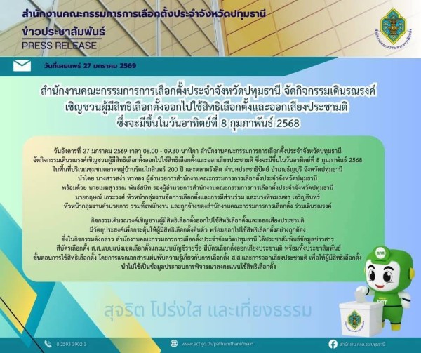 เมื่อวันอังคารที่ 27 มกราคม 2569 เวลา 08.00 – 09.30 น. สำนักงานคณะกรรมการการเลือกตั้งประจำจังหวัดปทุมธานี จัดกิจกรรมเดินรณรงค์เชิญชวนผู้มีสิทธิเลือกตั้งออกไปใช้สิทธิเลือกตั้งและออกเสียงประชามติ ซึ่งจะมีขึ้นในวันอาทิตย์ที่ 8 กุมภาพันธ์ 2568 ในพื้นที่บริเวณชุมชนตลาดหมู่บ้านรัตนโกสินทร์ 200 ปี และตลาดรังสิต ตำบลประชาธิปัตย์ อำเภอธัญบุรี จังหวัดปทุมธานี